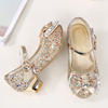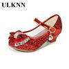 ULKNN الاطفال أحذية من الجلد للفتيات زهرة عادية بريق الأطفال عالية الكعب 2021 الفتيات أحذية فراشة عقدة الأزرق الوردي الفضة