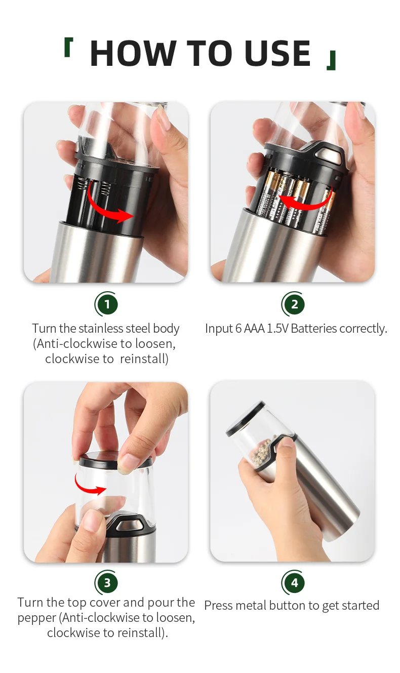 • It comes with 3 white LED lights for seeing how much pepper is coming out of the grinder easily.
