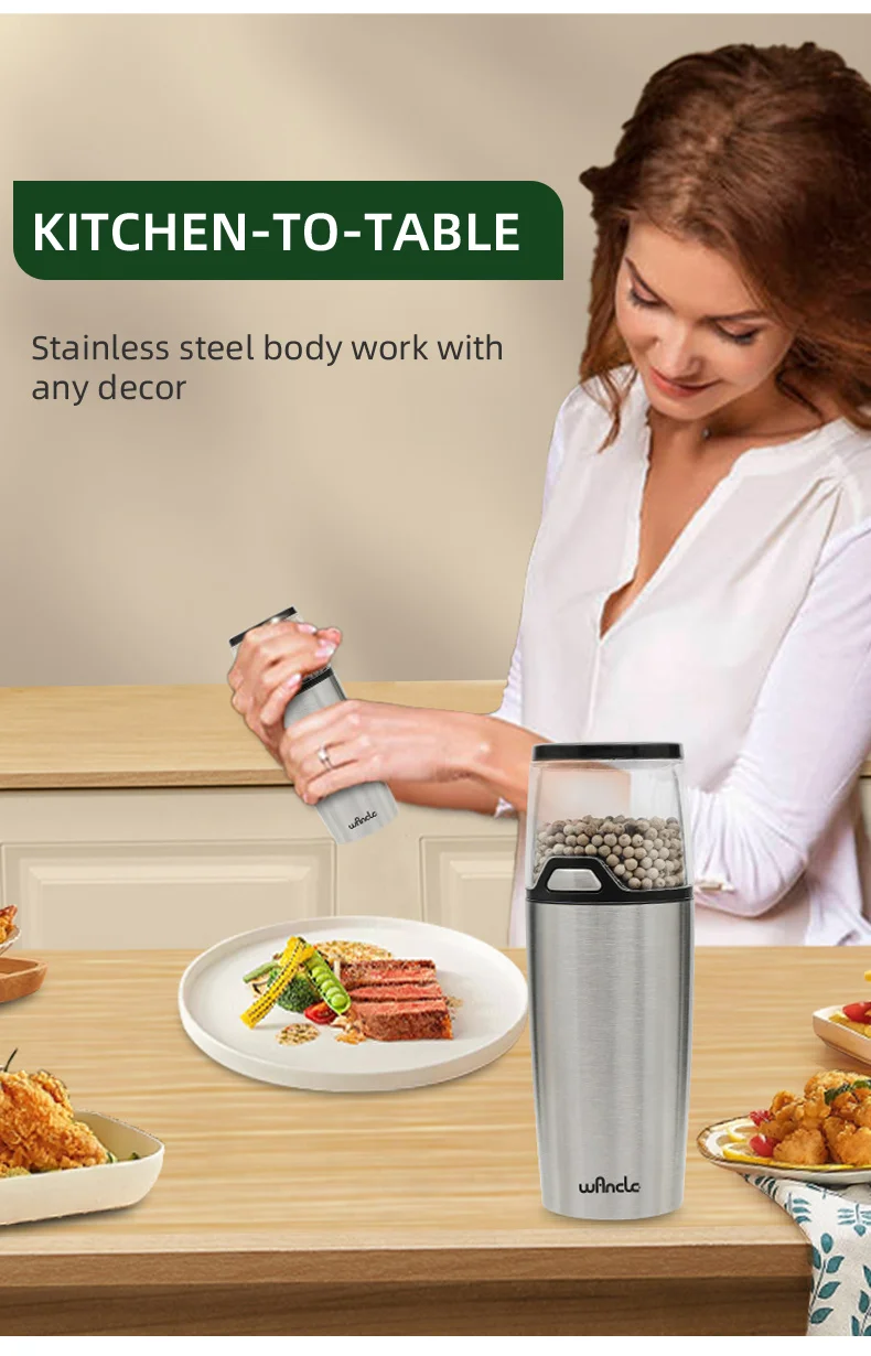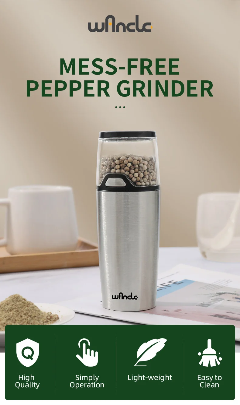 • Stylish brushed stainless steel pepper grinder with clear BPA-free body shows when contents are running low. Suitable for all dinner tables and kitchen countertops.