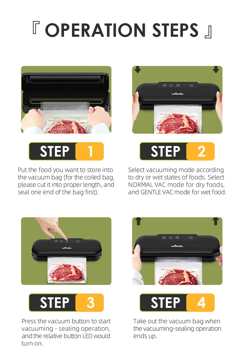 Wancle Vacuum Packing Machine offers you 4 vacuum modes: NORMAL VAC, GENTLE VAC, SEAL and MANUAL. GENTLE VAC mode is recommended for water and fatty foods.