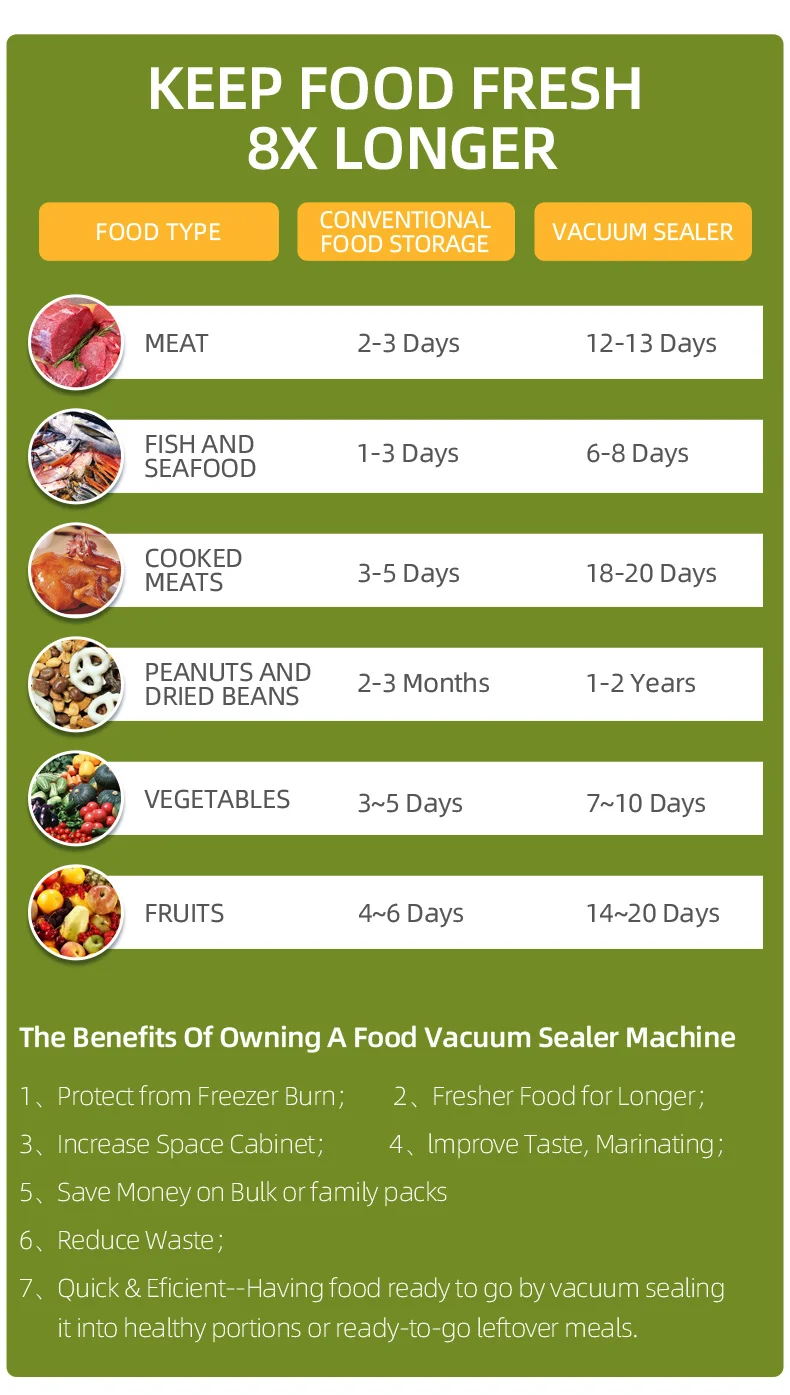 After food is sealed, the storage time can be extended by 8 times. Don’t waste food anymore, save your money and time.