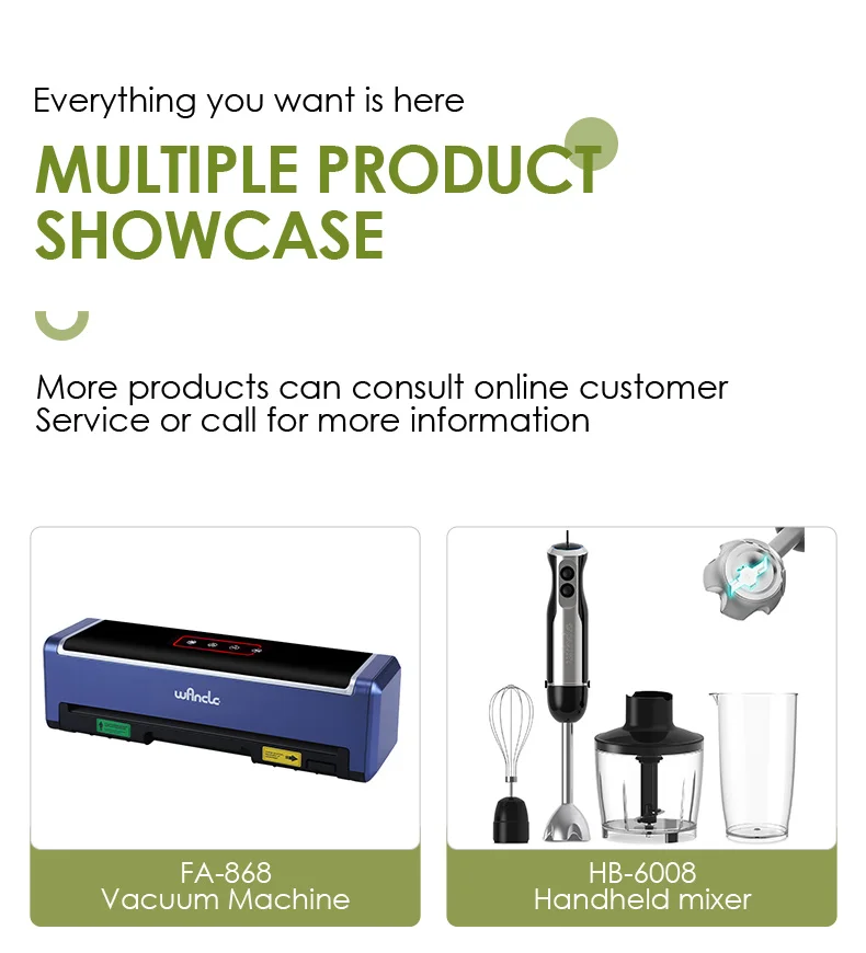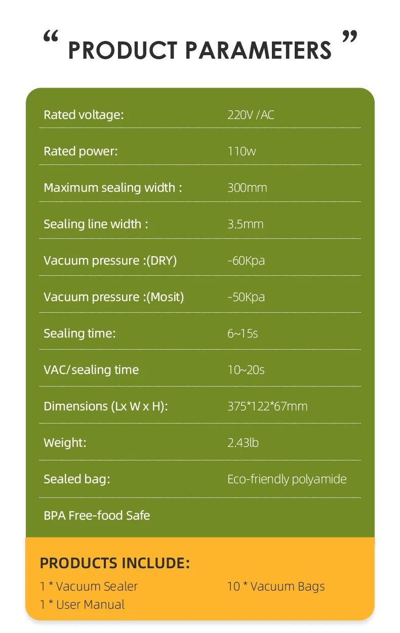You will get: 1 Wancle Vacuum Sealer Machine, 10 Food Vacuum Sealer Bags, 1 Wancle Vacuum Sealer User Manual with reliable quality. If you have any questions about using the product, please feel free to contact us.