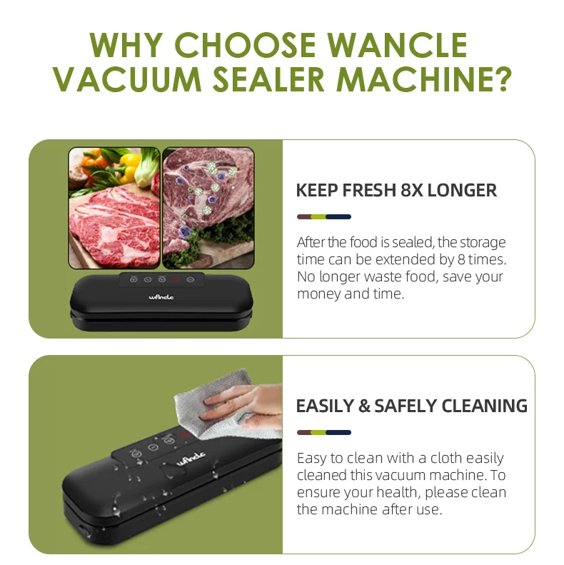 Wancle Vacuum Sealer can easily dispose of excess food, saving money and space. After vacuuming, put it in the refrigerator to keep it fresh for 8 times longer.
