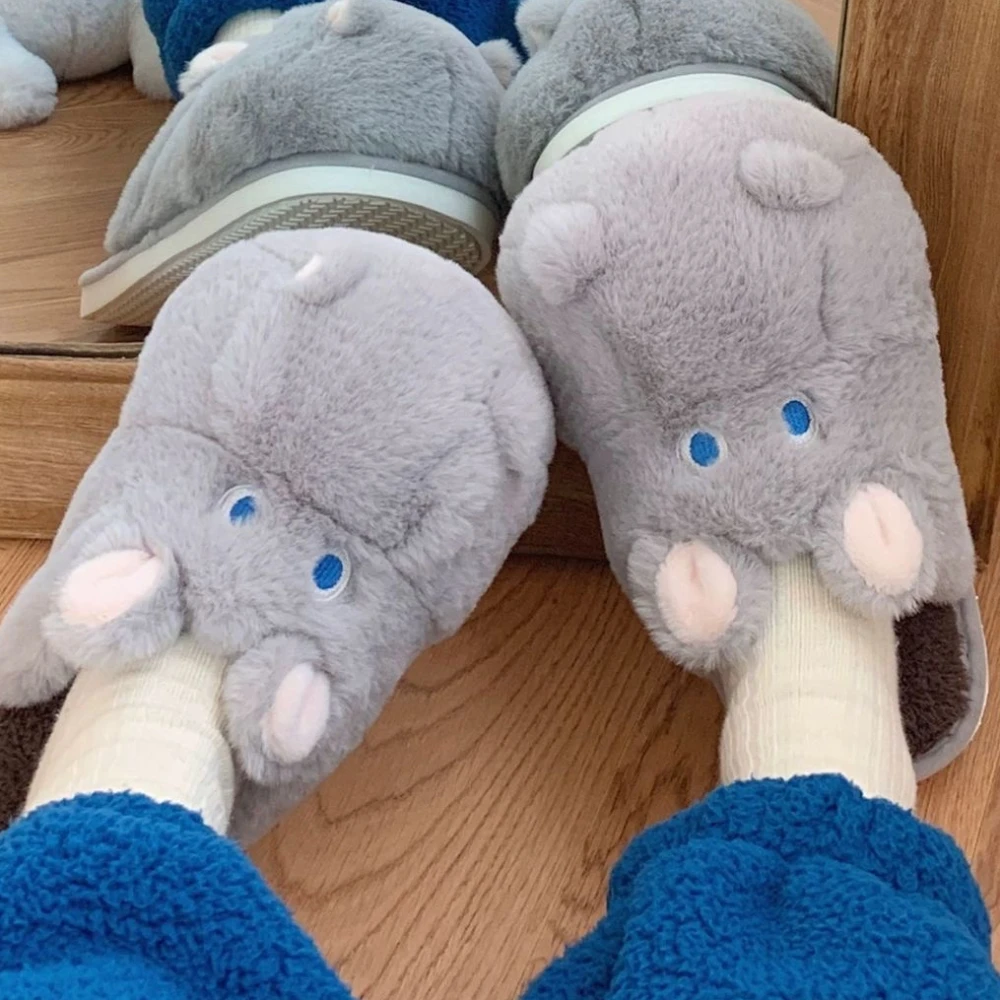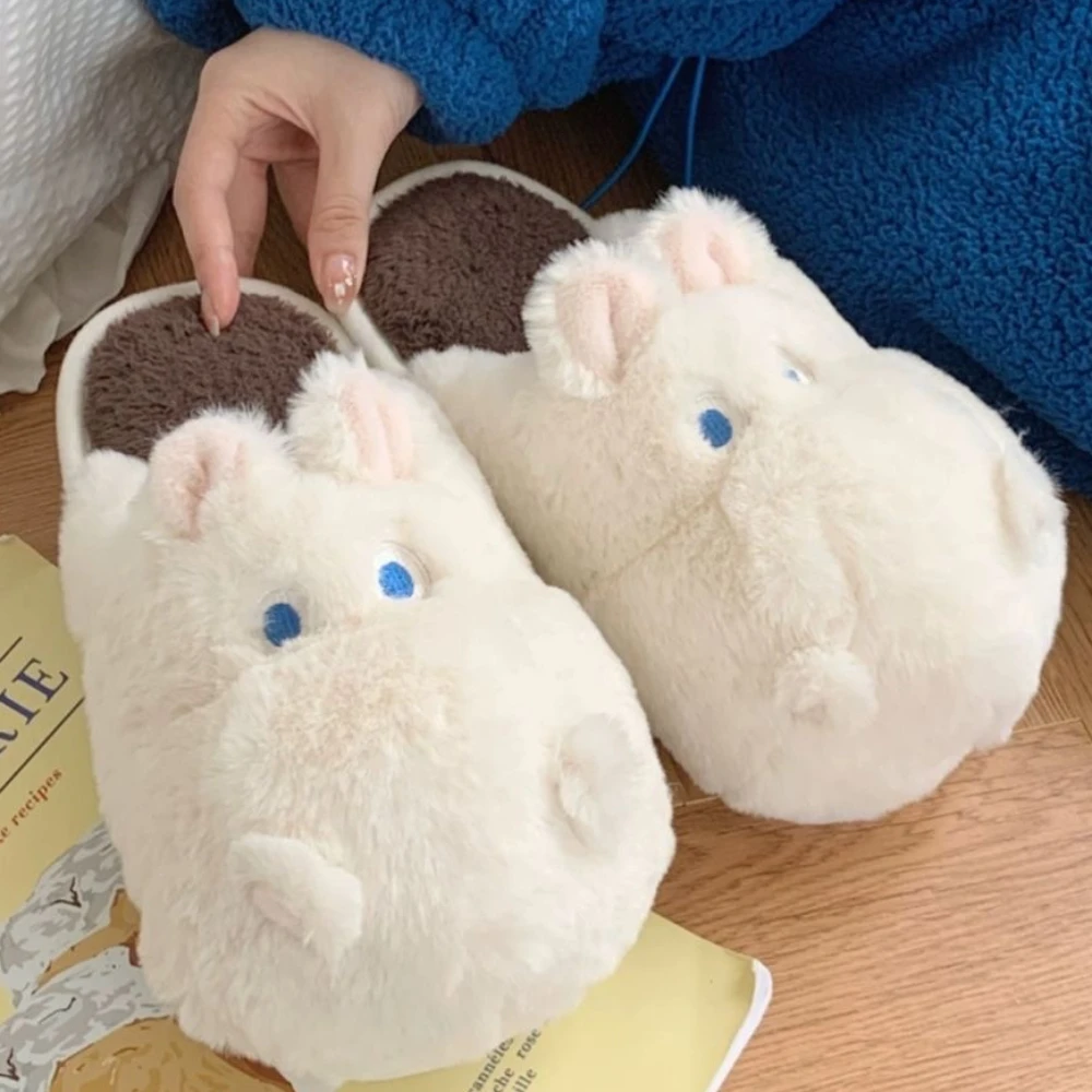 Winter Women Cute Home Plush Slippers Cartoon Hippo Warm Faux Fur Lining Fluffy Cozy Flat Non Slip Sole Ladies Shoes