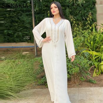 Siskakia Ramadan Muslim Elegant Women Evening Dress Solid V-Neck abaya Morocco Dubai Long Sleeve Polyester Kaftan