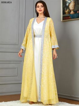 Siskakia Dubai Fashion Set Floral Gold Stamping Open Kimono And White Sleeveless Under Dress With Sashes Jalabiyat African Robe