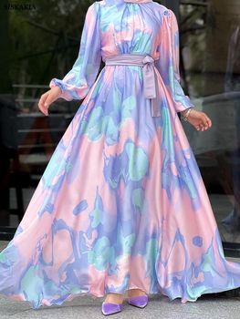 Siskakia Kaftan Eid Muslim Women Long Dresses Dubai Fashion Satin Party Gown High Neck Long Sleeve Belted Abayas Saudi Kebaya