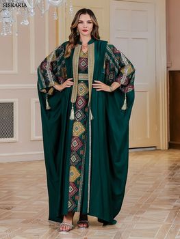 Siskakia Ramadan Dubai Luxury Women Abayas Embroidery Two Piece Set Batwing Sleeve Kaftan Belt included Party Dresses