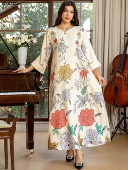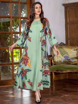 Siskakia Muslim Printing Dress For Woman Batwing Sleeve O-Neck Dubai Abaya Elegant Casual Loose Moroccan Saudi Kaftan Fashion