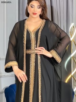 Siskakia Dubai Luxury Set Solid Long Dress And Chiffon Abaya Fashion Floral Gold Stamping Lace Tape Moroccan Evening Clothing
