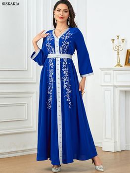 Siskakia Ramadan Muslim V-Neck Embroidery Maxi Abaya Loose Caftan Marocain Dresses For Women Gala