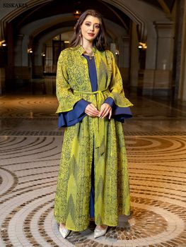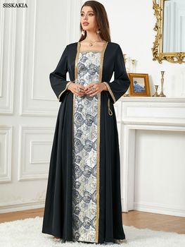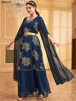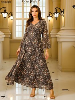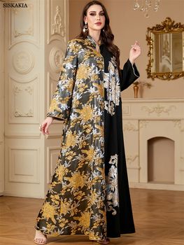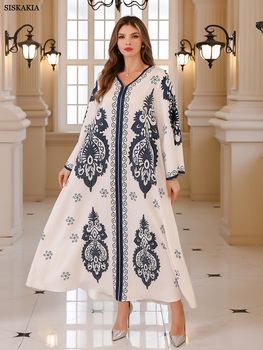 Siskakia Ramadan Dubai Embroidery Floral Print Abaya Muslim Elegant Women Evening Dress Moroccan Polyester Loose Kaftan