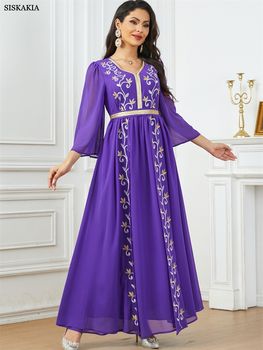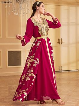 Siskakia Muslim Fashion Beading Ebroidered Print V-neck long-sleeved Dress Moroccan Islamic Dress With Belt Elegant Party Dress