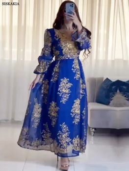 Siskakia Ramadan Dubai Gold Stamping Belted Kaftan Mesh Super Full Sleeves Muslim Elegant Women Evening Dress