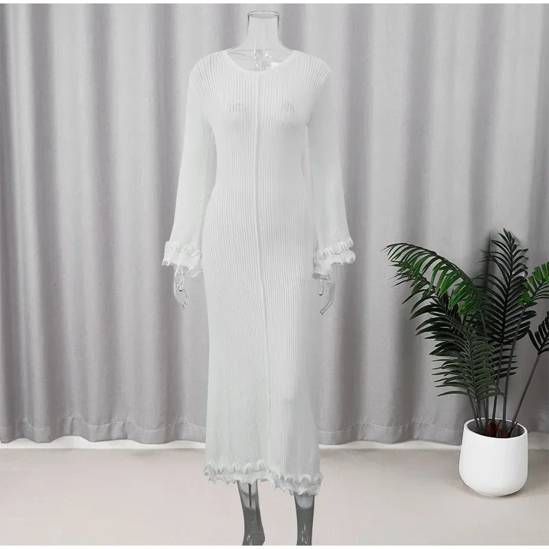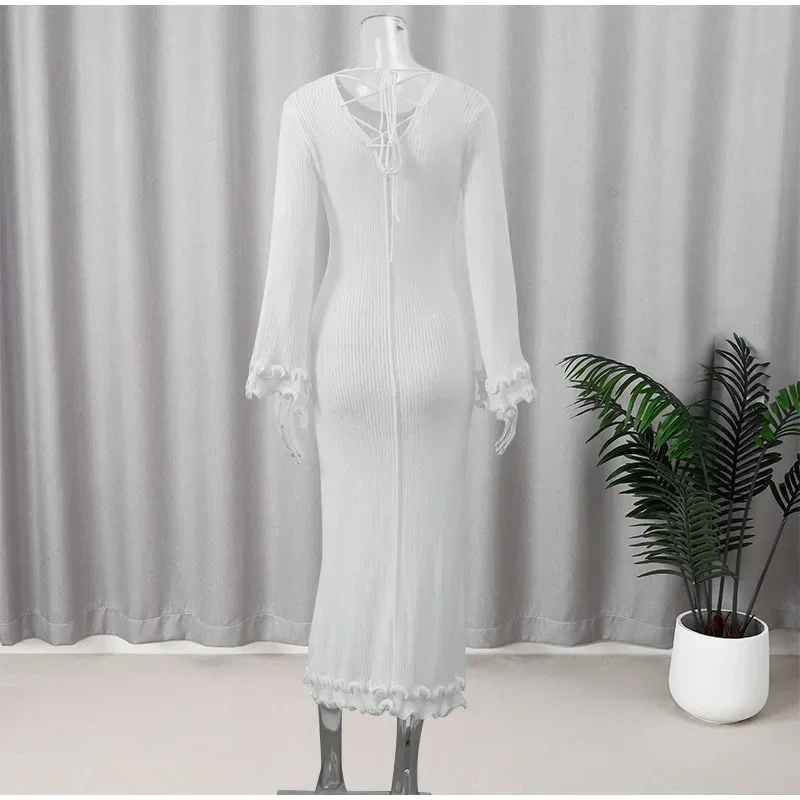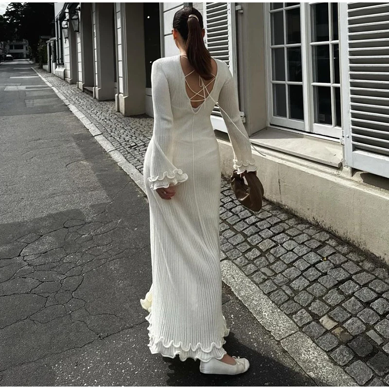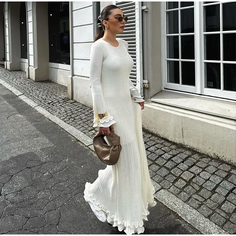 Women Elegant Solid Lace Up Pleated Hem Knit Maxi Dress Chic Full Sleeve Round Neck Slim Long Dresses Lady New Highstreet Robes