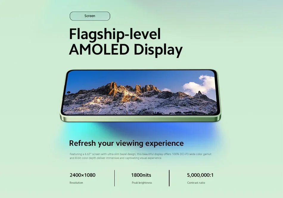 >Screen——–120Hz FHD+ 6.67″ AMOLED display,Resolution: 2400 x 1080,Brightness: 1800nits peak brightness