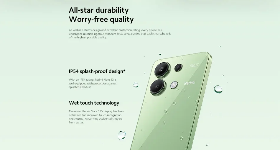 With an IP54 rating, Redmi Note 13 is well-equipped with protection against splashes and dust.