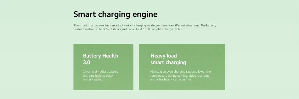 The smart charging engine can adopt various charging strategies based on different situations. The battery is able to retain up to 80% of its original capacity at 1000 complete charge cycles.