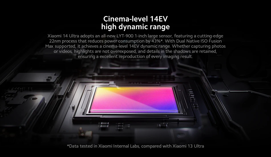 Xiaomi 14 Ultra adopts an all-new LYT-900 1-inch large sensor, featuring a cutting-edge 22nm process that reduces power consumption by 43%*. With Dual Native ISO Fusion Max supported, it achieves a cinema-level 14EV dynamic range. Whether capturing photos or videos, highlights are not overexposed, and details in the shadows are retained, ensuring an excellent reproduction of every imaging result.